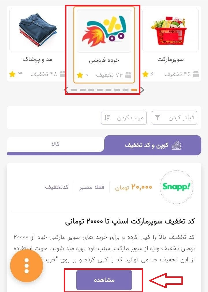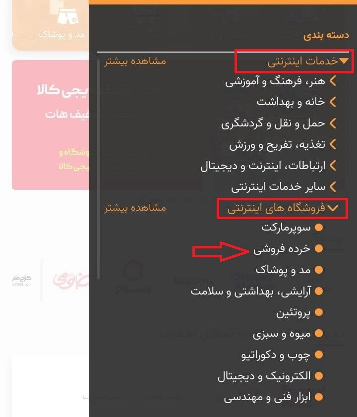 شما با استفاده از تب های موجود در سایت تخفیف هات نیز می توانید اقدام به دریافت کد تخفیف باسلام کنید. برای این امر از بین تب های موجود در صفحه اصلی ابتدا روی تب خدمات اینترنتی و سپس روی گزینه خرده فروشی کلیک کنید تا کد های تخفیفی باسلام برای شما نمایش داده شود.